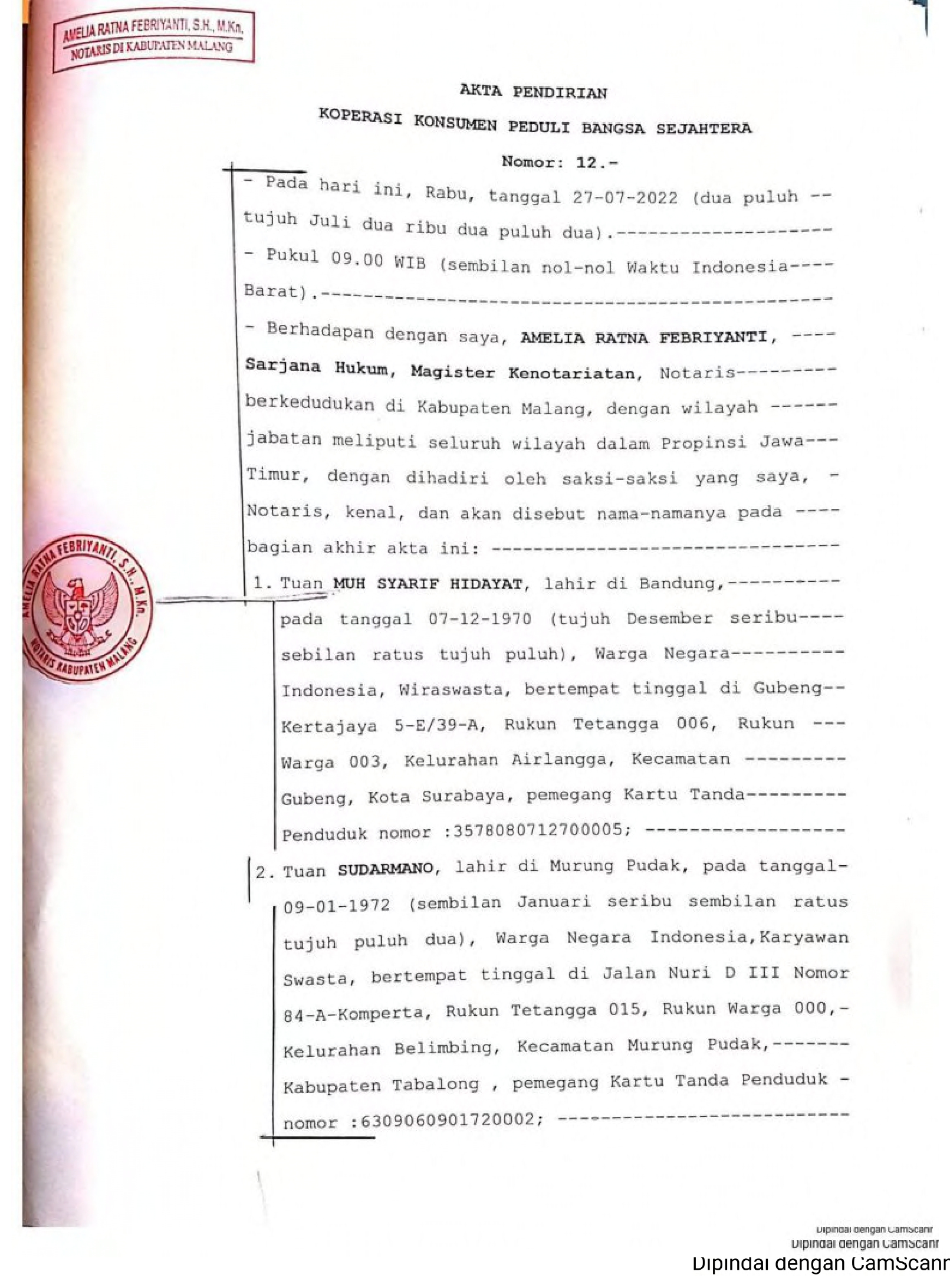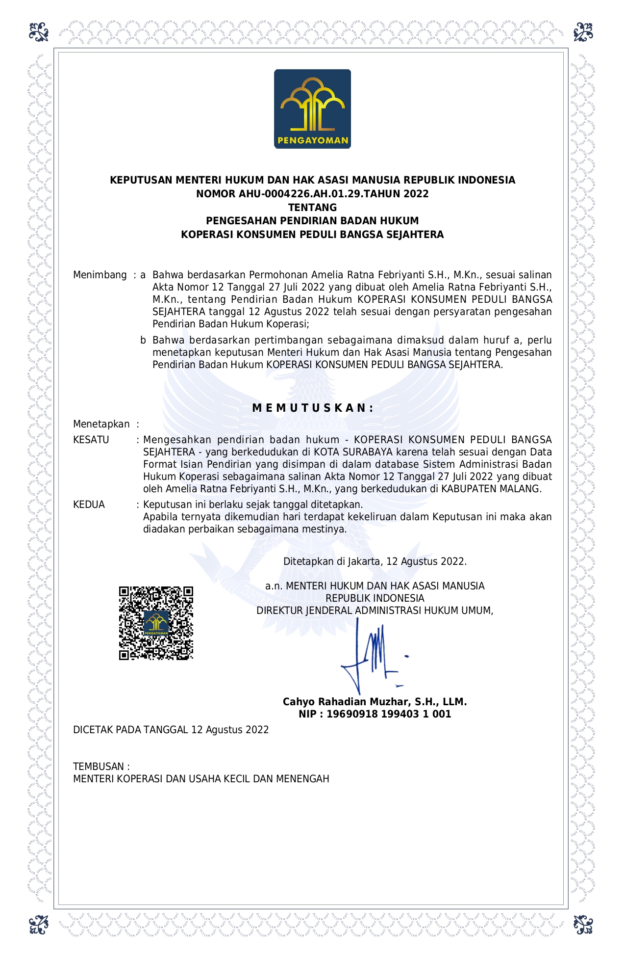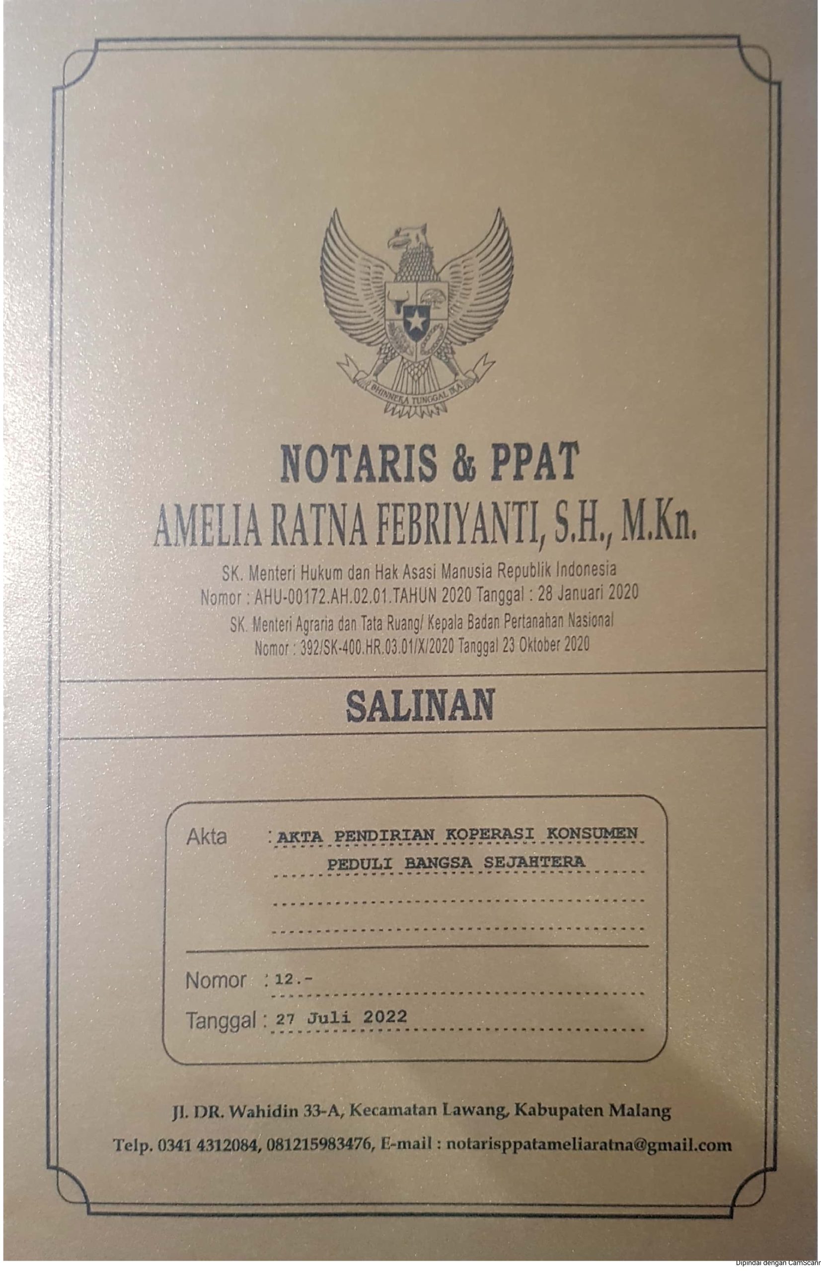 Koperasi Konsumen Peduli Bangsa Sejahtera didirikan berdasarkan Akta Pendirian Nomor 12 tanggal 27 Juli 2022 yang dibuat oleh Notaris Amelia Ratna Febriyanti, S.H., M.Kn., dan telah memperoleh pengesahan sebagai badan hukum dari Menteri Hukum dan Hak Asasi Manusia Republik Indonesia melalui Keputusan Nomor AHU-0004226.AH.01.29 Tahun 2022 pada tanggal 12 Agustus 2022.